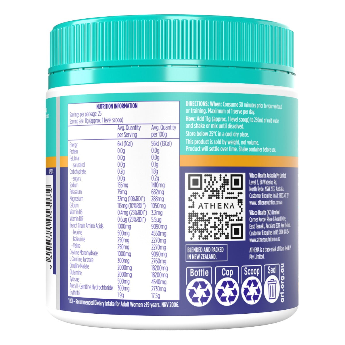 Ingredients: Citrulline Malate, L-Glutamine, Sweeteners (Erythritol, Sucralose), Branched Chain Amino Acids [L-Leucine, L-Isoleucine, L-Valine, Emulsifiers (Soy Lecithin, Sunflower Lecithin)], Creatine Monohydrate (9%), Vitamins and Minerals (Calcium Citrate, Magnesium Phosphate, Vitamin B6, Vitamin B12), L-Tyrosine, L-Carnitine Tartrate, Salt, Acetyl L-Carnitine Hydrochloride, Acidity Regulators (Potassium Citrate, Sodium Bicarbonate), Flavours, Anticaking Agent (Silicon Dioxide), Colours (Curcumin, Carotene).