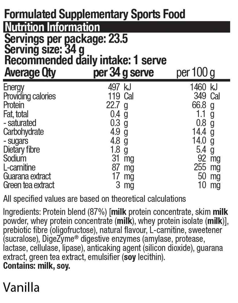 A protein powder for weight management due to its high protein, low carb and fat content bringing in just 119 Calories per serve and added thermogenic ingredients such as L-Carnitine, Guarana extract and Green Tea extract that can assist in speeding up metabolism. With 5x added digestive enzymes to break down milk lactose for an easy digestion as well as added fibre to add to the feeling of fullness and help us avoid consuming guilty calories. A great option for immediately post training to promote muscle results as well as a delicious mid meal snack on the go.