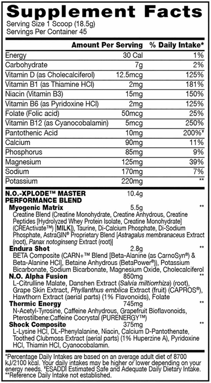 BSN N.O.-Xplode Pre-training igniter is a powerful preworkout that fuels the biggest pumps and the sharpest focus while boosting energy and endurance.