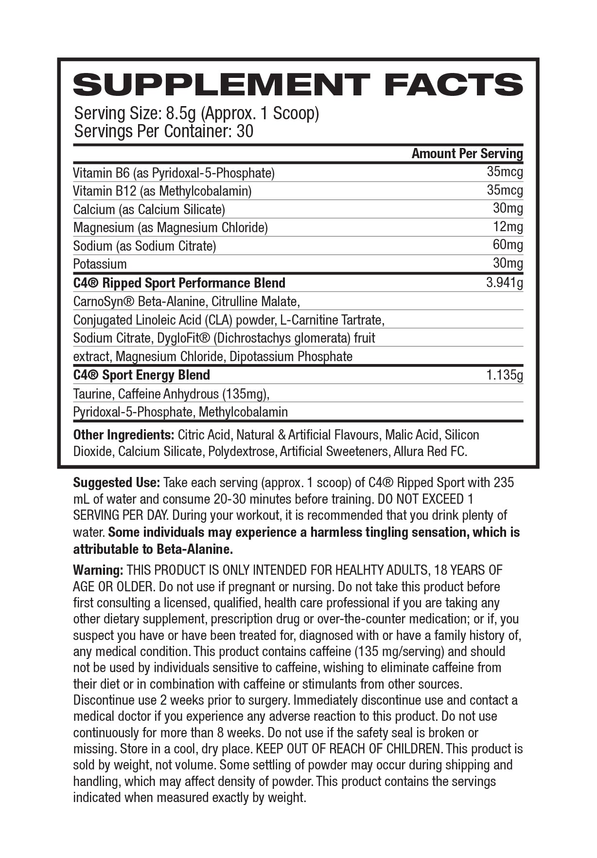 Take each serving (approx. 1 scoop) of C4® Ripped Sport, with 8 fl. oz. of water, and consume 20-30 minutes before training. Once tolerance has been assessed, take one additional serving (approx. 1 scoop) with the serving taken before training for added energy and weight loss support. During your workout, it is recommended that you drink plenty of water. Some individuals may experience a harmless tingling sensation, which is attributable to Beta-Alanine.