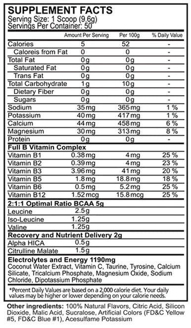 10g Essential Amino Acids (including 8g BCAAs). The combination of BCAAs and EAAs assist with muscular endurance, recovery & delays fatigue.