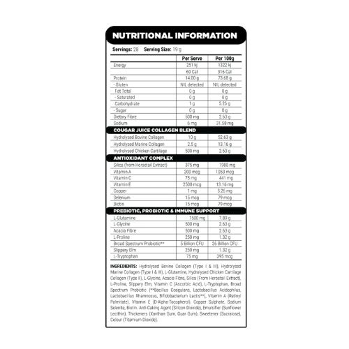 Faction Labs Cougar Juice contains 13g of Collagen, Prebotics, Probiotics, Antioxidants and an Immune Support Matrix, Faction Labs Cougar Juice will have you radiating inside and out.