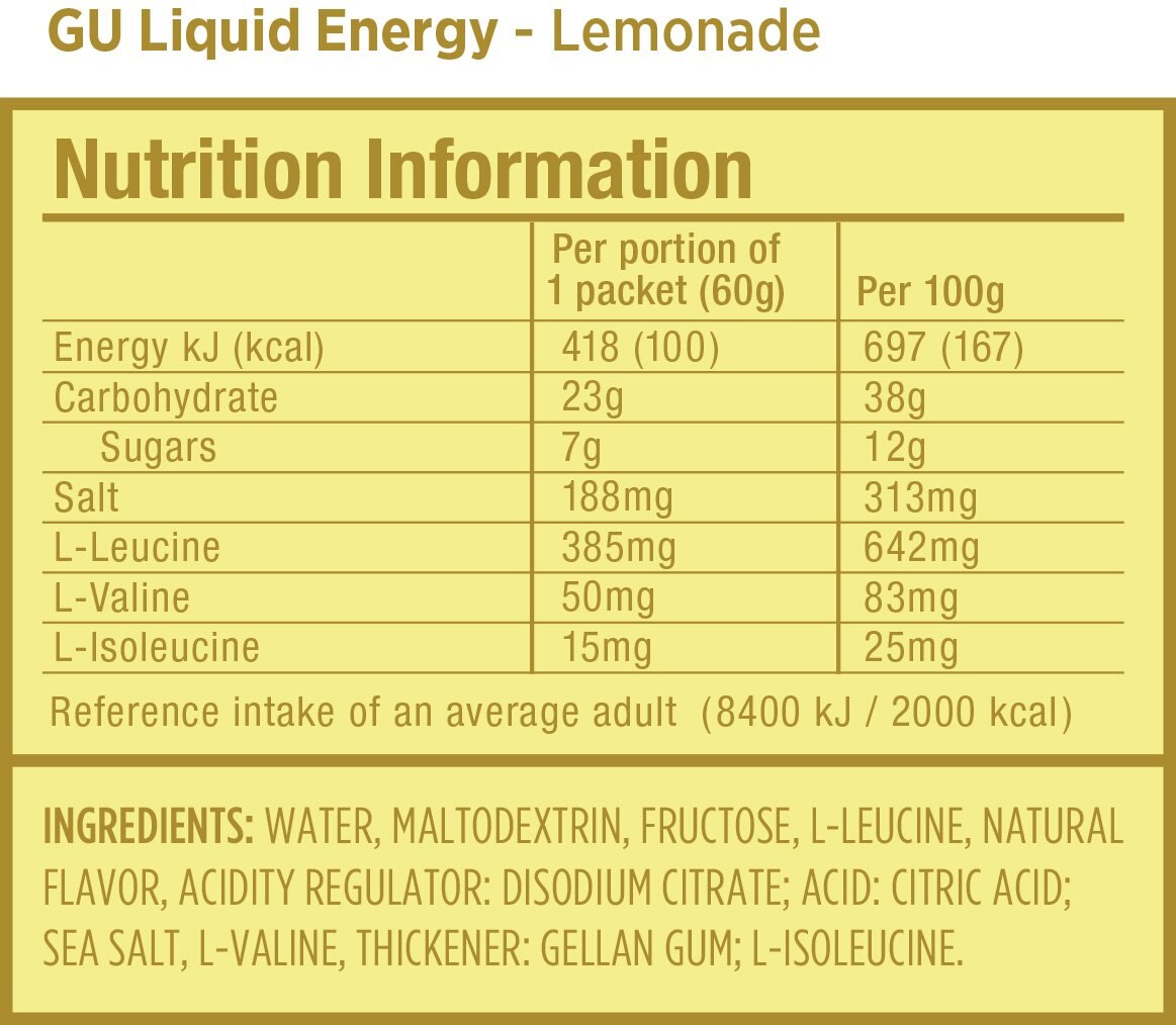 GU Liquid Energy comes in both caffeinated and non-caffeinated flavours. Caffeine consumption during exercise improves performance in several ways: it sharpens focus and perks you up; but more importantly, it helps the body produce more power, reduce the pain of hard efforts, and may even tap fat for fuel during exercise. All of this prolongs your ability to exercise at a high intensity. We use just enough caffeine to jump start this benefit and no more.