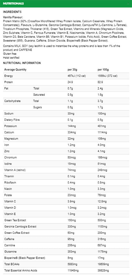 Please note: nutritional information is to be used as a guide only, actual values may differ between flavours and sizes and when formulations are modified or updated by the manufacturer. Contact us if you are have any questions regarding this products ingredients.