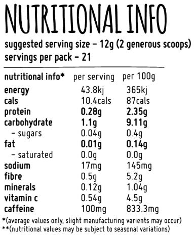 12g (2 generous scoops) mixed with 250ml of water. For individuals sensitive to caffeine we recommend testing your tolerance first with a half serve.