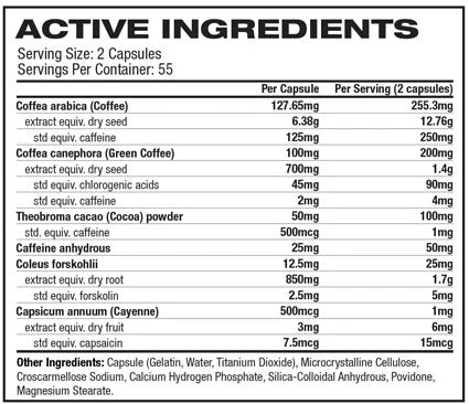 Coffea canephora (Green Coffee), Caffeine Anhydrous, Theobroma Cacao (Cocoa) Seed Powder, Plectranthus barbatus (Coleus forskohlii), Capsicum annuum (Cayenne).