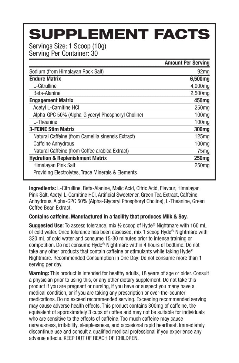 HYDE® Nightmare is a pre workout powder, formulated for high-performance athletes who endure an excessive amount of physical and mental stress. Driven by clinically researched ingredients to improve muscular and mental performance, HYDE® Nightmare also replenishes lost fluids during rigorous activity