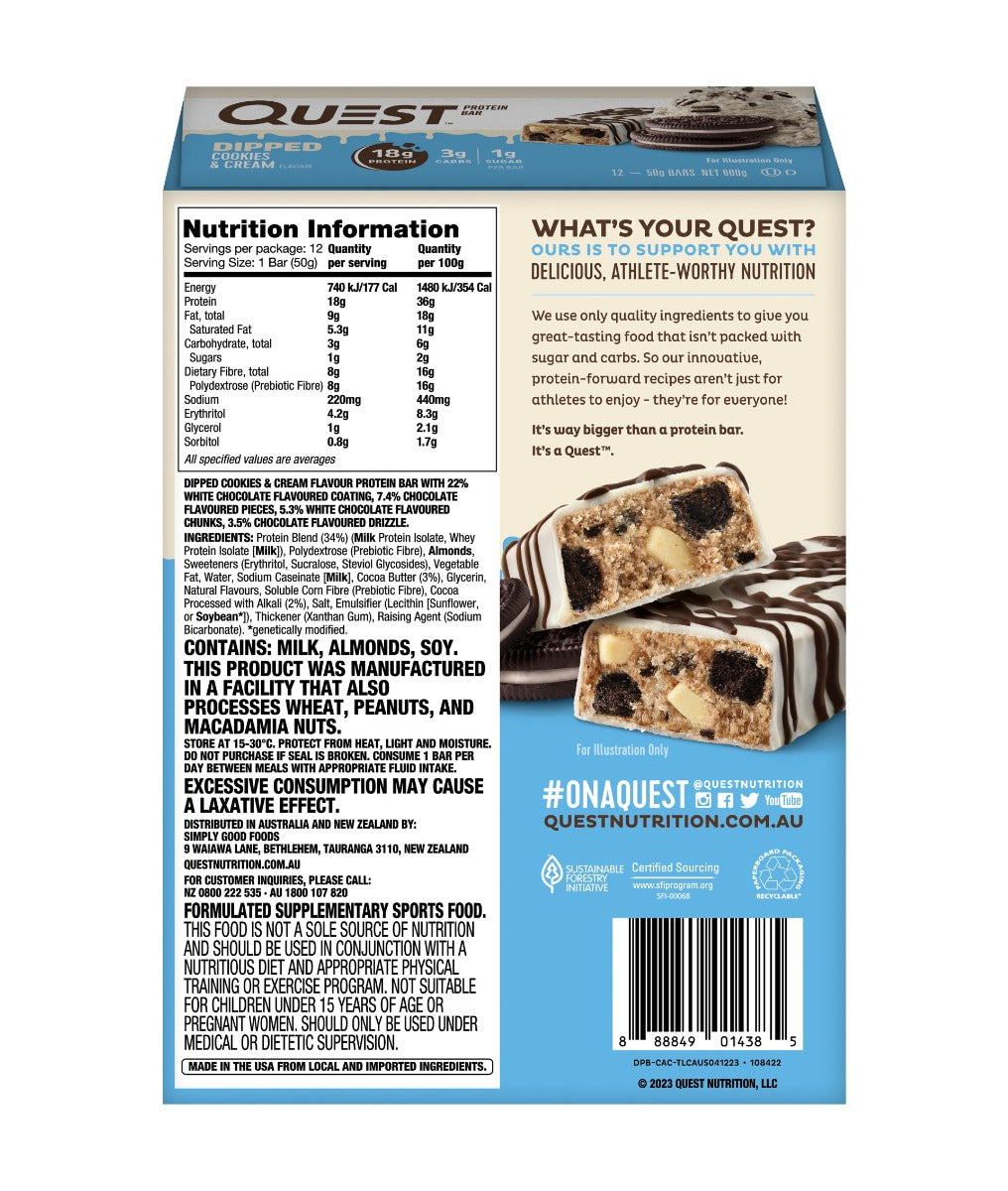 Your favourite Quest protein bars! Try them Dipped! Try the protein bars with 18g of protein and 3g of carbs*, and dipped in chocolatey goodness.