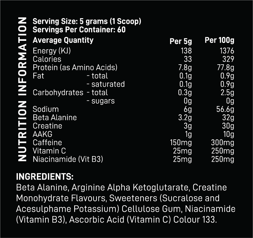 Take one scoop (5g) in 400ml water 20 minutes before training. Adjust water to taste. During your workout, it is recommended that you drink plenty of water or performance beverage. Some individuals may experience a harmless tingling sensation, which is attributed to beta alanine.
