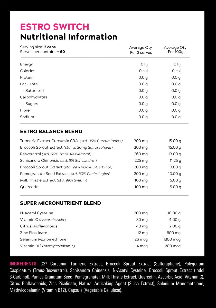 ESTRO Switch™ also contains an abundance of antioxidants including Resveratrol, Schisandra Chinensis, Pomegranate Seed Extract, Milk Thistle, Quercetin and N-Acetyl Cystine.